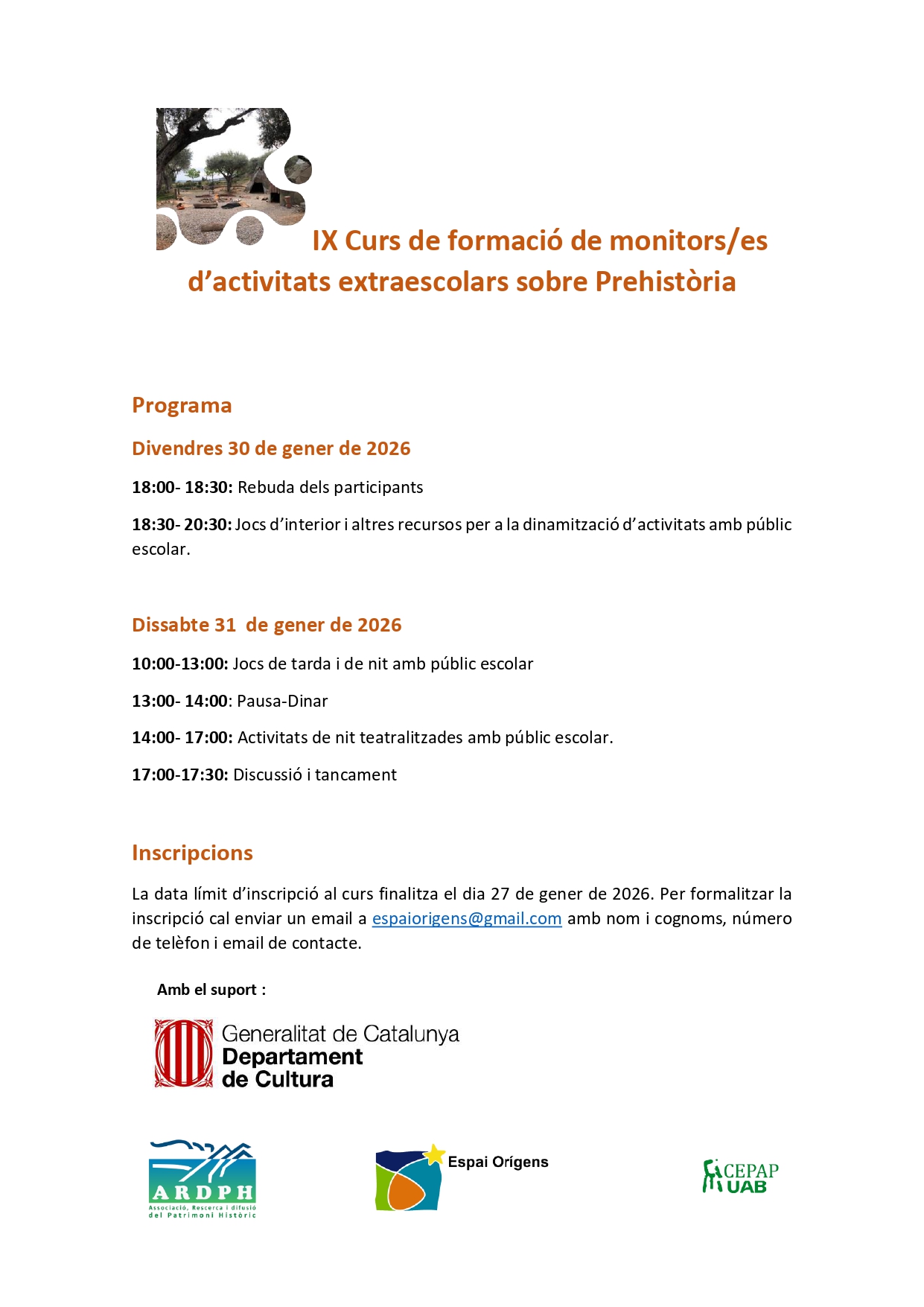 L’Associació Recerca i Difusió del Patrimoni Històric (ARDPH) organitza , amb la col·laboració científica del Centre d’Estudis del Patrimoni Arqueològic de la Prehistòria de la Universitat Autònoma de Barcelona (CEPAP-UAB), la setena edició del curs de formació de monitors/es d’activitats extraescolars sobre Prehistòria que es realitzarà els dies 30 i 31 de gener de 2026 al Centre Espai Orígens de Camarasa i a altres ubicacions de la població de Camarasa i Sant Llorenç de Montgai . Aquest curs té el suport del Departament de Cultura de la Generalitat de Catalunya